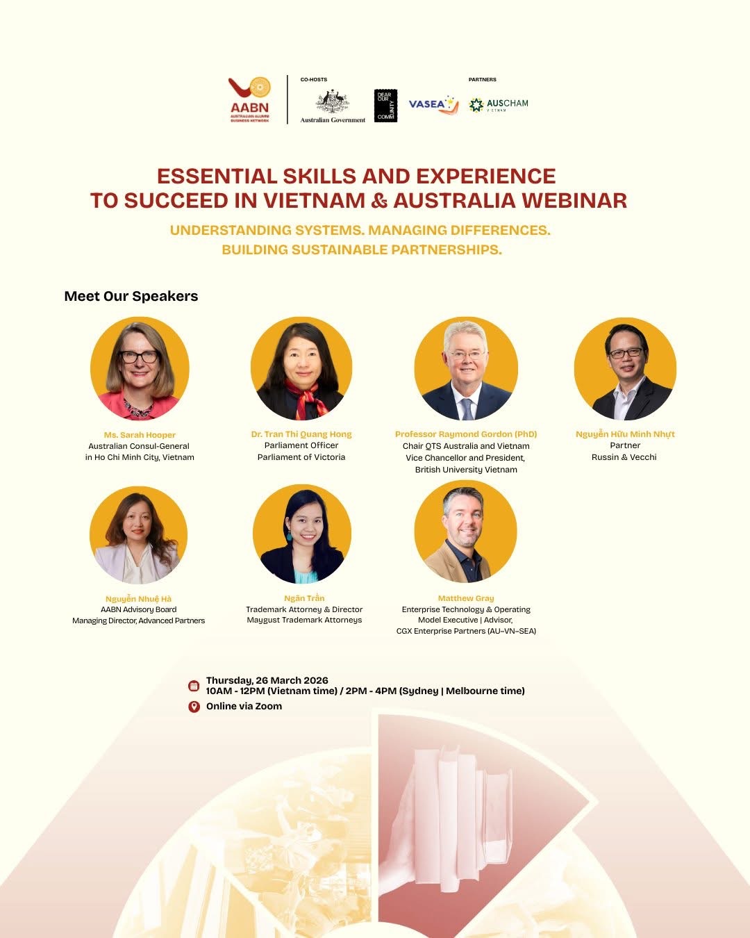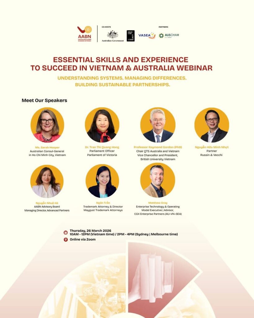 Photo: 26th March 2026 , Ha Nguyen led a webinar co-hosted with the Australian Government and the Australian Consulate-General in Ho Chi Minh City, featuring Australian Consul-General Mrs. Sarah Hooper and a panel of leading legal, business, and academic experts. The session provided practical insights into navigating regulatory, operational, and cultural differences between the two markets.